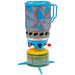 The stove unit has a piezo ignition for easy lighting and is protected from wind and rain by the heat transmitter. The cooking unit seamlessly attaches to the bottom of the mug and the gas valve lever folds away for protection.